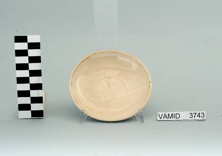 - NOTIZIE STORICO CRITICHE La mancanza del marchio impedisce di risalire con esattezza alla ditta produttrice. L'oggetto è comunque attribuibile ad una generica manifattura italiana. La tipologia del vasellame e il bordo sottolineato da leggere profilature in oro che si stagliano sul fondo bianco avorio della terraglia indicano una datazione alla prima metà del Novecento. La mancanza di caratteri stilistici particolari e di motivi ornamentali impedisce una definizione cronologica più circoscritta. Il piattino fa parte di una donazione di privati al Museo (Passera Gambella Enrichetta, 10 ottobre 2007).