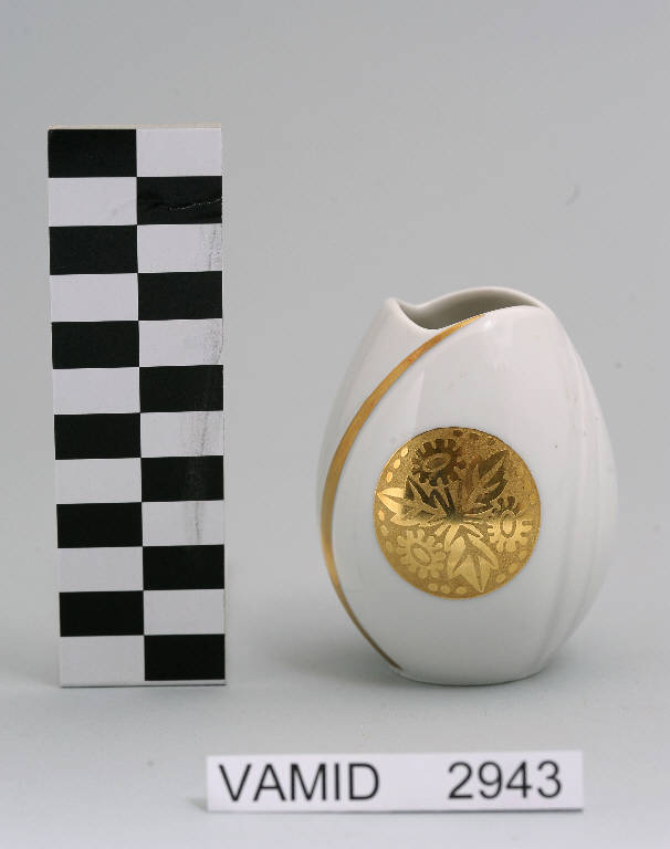 - NOTIZIE STORICO CRITICHE La decorazione a stampa in esame rientra nella raffinata tecnica definita "incisa oro secchino" che permette di scavare lo smalto e far risaltare in oro il decoro. Non esistono notizie relative a una collaborazione tra Marco Costantini e la ditta di porcellane Arzberg. Pertanto è possibile che il vasetto sia stato prodotto in Germania nel secondo quarto del Novecento, come denota la ricerca stilistica della forma dell'oggetto, e poi importato in Italia dove, in un secondo momento, è stato decorato dal Costantini, forse proprio negli anni in cui realizzò degli oggetti simili per la "Società Ceramica del Verbano" o poco dopo l'apertura della sua bottega avvenuta nel 1966. Il vasetto fa parte di una donazione di privati al Museo. La stessa tecnica applicata con soggetti diversi è riscontrabile in un portastecchini (num. inv. 2941) e tre posaceneri prodotti dalla "Società Ceramica del Verbano" uno dei quali, però, non reca la sua firma (nn. inv. 3719-3721) e due vasetti prodotti dalla ditta tedesca "Arzberg" (nn. inv. 2942, 2944) conservati presso il Midec.