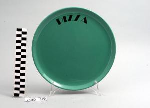 Piatto da pizza circolare privo di tesa e con bordo rialzato; fondo di colore verde con la scritta "PIZZA" in nero in posizione decentrata.