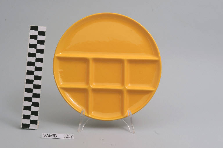 - NOTIZIE STORICO CRITICHE L'oggetto in esame, prodotto serialmente anche in altri colori, si inserisce in un filone di stoviglie di gusto corrente. Si tratta di una tipologia di vasellame da utilizzare con una precisa pietanza: la fondue bourguignonne, una specialità della regione transalpina della Svizzera. I diversi scomparti in cui è suddiviso il piatto, messo a disposizione di ogni commensale, impediscono che le diverse salse e i piccoli pezzi di carne cotti nell'olio vadano a mischiarsi. La mancanza del marchio impedisce di risalire con esattezza alla ditta produttrice. L'oggetto è comunque attribuibile ad una generica manifattura italiana. La foggia funzionale ed essenziale caratterizzata da un bordo semplicemente rialzato e il colore rosso uniforme fanno del piatto un prodotto di design databile alla seconda metà del Novecento. L'oggetto fa parte di una donazione di privati al Museo. Nel Midec è conservato un piatto tipologiamente simile nella versione color rosso (num. inv. 3236).