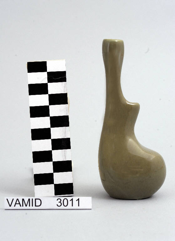 Vasetto asimmetrico panciuto nella parte inferiore con collo alto e stretto; fondo di colore grigio-verde uniforme.