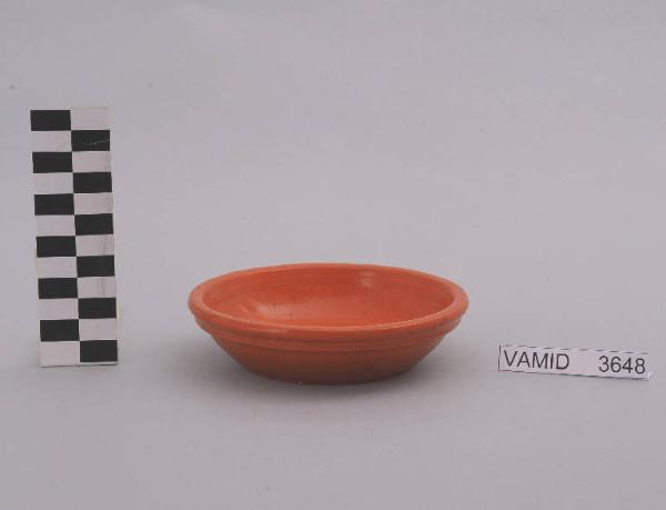 Ciotola a sezione circolare con corpo leggermente svasato; restringimento in prossimità del piede; fondo color arancio.