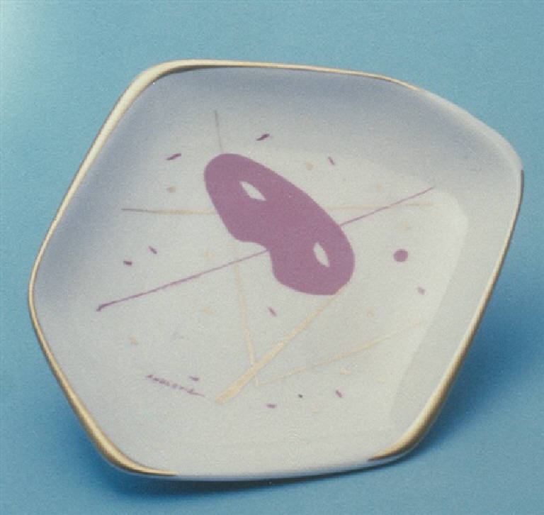 - NOTIZIE STORICO CRITICHE Alla metà del Novecento Guido Andlovitz, direttore artistico della Società ceramica Italiana dal 1923 al 1961, si cimentò in alcune decorazioni per posaceneri (cfr. anche nn. inv. 1386, 1474) ispirate al motivo delle maschere carnevalesche, sviluppando un genere introdotto negli anni '30. L'oggetto in esame rientra in una cospicua serie di posacenere in porcellana realizzata nello stabilimento Verbano per la ICAT di Torino.\nIl decoro e il posacenere compaiono nei cataloghi dello stabilimento Verbano custoditi presso archivio della SCI con numero 4276 per quanto riguarda il decoro (busta 85, fascicolo 2 e busta 85, fascicolo 1) e numero 10121 per quanto riguarda il posacenere (busta 85, fascicolo 1).