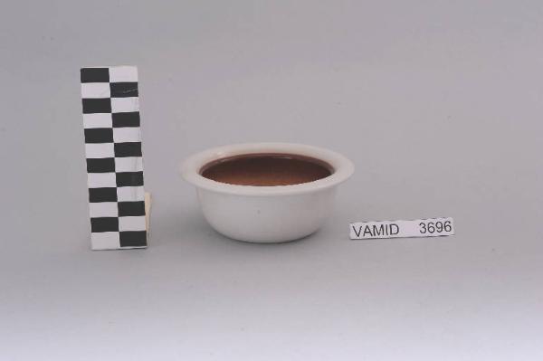 Pirofila circolare di colore bianco con bordo estroflesso; marrone internamente.