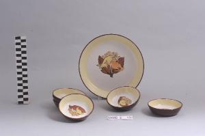 Servizio composto da una fruttiera e sei ciotole di forma circolare rifinite con alto bordo color giallo pastello; fondo bianco decorato al centro con figurazioni policrome; bordi rifiniti con filettatura marrone; marrone esternamente.