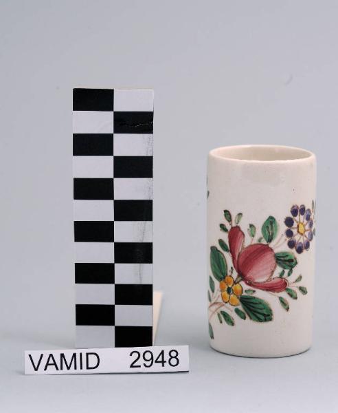 Vasetto cilindrico in terraglia smaltata bianca con decori floreali policromi realizzati a mano.