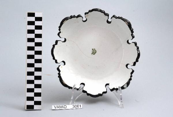 Fruttiera con bordi a foglie (di acanto?) lavorate a giorno, smaltate di nero esternamente e rifinite con doratura.
