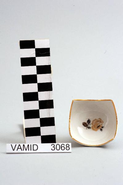 Bomboniera, o ciotolina, di forma quadrata con angoli sollevati in porcellana bianca; filettatura d'oro sul bordo e decorazione con rosellina in nero e oro sul fondo.