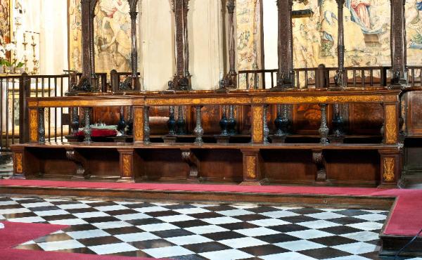 - NOTIZIE STORICO CRITICHE Nel 1531 il coro di Giovan Francesco Capoferri fu dotato di quattro inginocchiatoi intarsiati (due ad angolo tra il braccio frontale e le ali laterali e due a completamento della lunghezza delle ali laterali) ad opera dello stesso maestro loverese con la collaborazione del falegname Pietro Tiraboschi e dell'intagliatore Alessandro Belli. Gli inginocchiatoi rispettavano il progetto iniziale del coro eseguito nel 1523 dal Capoferri e da Giovanni Belli con la consulenza di Bernardo Zenale. Per questi inginocchiatoi furono forniti i disegni di nove Profeti e nove Sibille dal pittore Lucano Gaggio da Imola dietro indicazione del teologo fra Girolamo Terzi. Una pianta del coro disegnata nel 1855 in occasione dei restauri del Carrara documenta anche la presenza di un "letturino" rettangolare. Quest antico "oratorio" non esiste più, fu rimosso e sostituito con nuovi genuflessori all'inizio del Novecento. La proposta di rinnovare i banchi del presbiterio con "artistici genuflessori", avanzata nel 1898, non fu immediatamente attuata. I quattro banchi, da porsi davanti ai tre bracci del coro cinquecentesco (due piccoli ai lati dell'ingresso e due grandi lungo le ali laterali), furono realizzati dal 1903 al 1905 ad opera del restauratore Luigi Chiesa, che eseguì i primi tre, e dell'intagliatore Giuseppe Villa che subentrò alla morte del Chiesa nel 1905. Due furono offerti dall'ing. Luigi Danioni, consigliere delegato della Congregazione di Carità, a cui si deve probabilmente anche il loro disegno, uno dal priore mons. Giulio Venanzi e il quarto dal notaio Luigi Fumagalli, presidente della Congregazione.