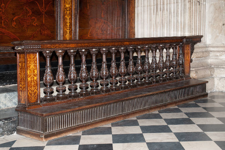 Pedana con fascia scanalata; parapetto delimitato alle estremità da pilastrini parallelepidi con pannelli intarsiati in acero con motivi a candelabra e formato al centro da sedici balaustri intagliati a foglie e scanalati; poggiamani con fregio intarsiato in acero a girali.