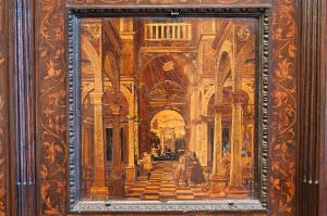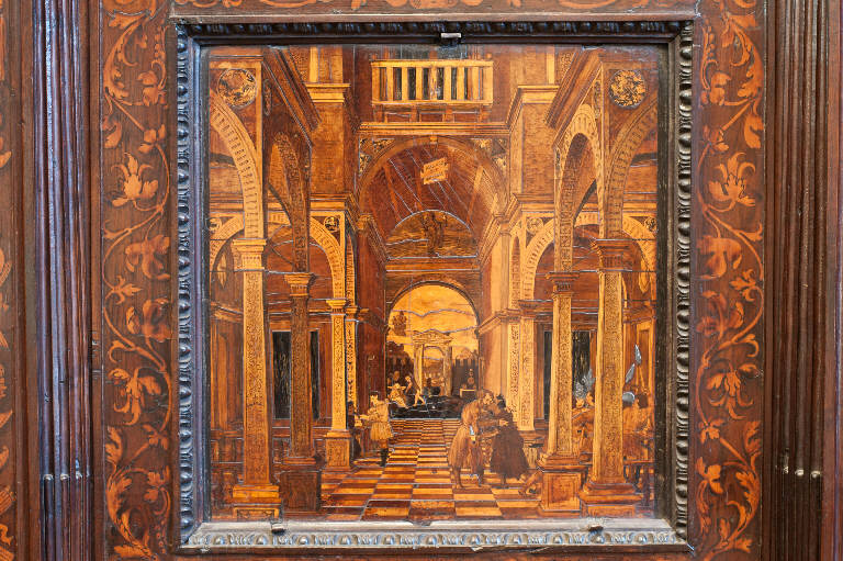 - NOTIZIE STORICO CRITICHE Nel 1522 il Consorzio della Misericordia Maggiore di Bergamo decise di dotare la basilica di Santa Maria di un nuovo coro e il 18 settembre di quell'anno deliberò di trattare con il legnaiolo e intarsiatore loverese Giovanni Francesco Capoferri per l'esecuzione dell'opera. L'artefice era noto a Bergamo fin dall'anno precedente per aver collaborato con fra' Damiano Zambelli all'esecuzione del coro intarsiato nella chiesa domenicana di Santo Stefano (ora in San Bartolomeo), inoltre nel 1522 il pittore Lorenzo Lotto gli aveva fatto tradurre in tarsia un suo disegno dell'Annunciazione (poi inserita nel bancale del celebrante, cfr. foto n. 904a) e questa dimostrazione aveva convinto il Consorzio ad affidare il lavoro al loverese. Al Capoferri, direttore dell'impresa del coro, fu affiancato il marangone Giovanni Belli di Ponteranica per i lavori di intaglio. Il principale teologo della città, fra Girolamo Terzi, fu incaricato di fornire le "inventiones" da dare ai pittori che avrebbero disegnato i cartoni da intarsiare.\nDopo aver acquisito alcuni cartoni forniti da pittori diversi, tra cui Lotto, Andrea Previtali, Francesco Rosso di Pavia, il 29 ottobre 1523 il Consorzio affidò i cartoni delle tarsie del coro al pressoché sconosciuto Nicolino Cabrini, che morì poco dopo. Il 12 marzo 1524 il Consorzio incaricò dunque Lorenzo Lotto di eseguire i disegni per le tarsie e dopo pochi mesi (2 giugno 1524) gli commissionò anche i pannelli intarsiati ("coperti") con imprese simboliche che dovevano proteggere le preziose tavolette. Lotto inizialmente effettuò anche la 'profilatura' delle tarsie, ovvero la loro rifinitura finale mediante stucco nero per i contorni delle figure e con ombreggiatura a fuoco per il chiaro-scuro, ma un contrasto di natura economica frenò la sua disponibilità. La profilatura fu allora effettuata dallo stesso Capoferri e dai pittori Andrea Previtali, Ludovico da Mantova e Lucano da Imola. Trasferitosi a Venezia nel dicembre del 1525, il pittore continuò a disegnare i cartoni delle tarsie e a inviarle a Bergamo fino al 1532, realizzando complessivamente 35 tarsie con storie bibliche di cui 4 grandi per l'iconostasi e 31 più piccole collocate oggi negli stalli del coro dei laici e nei due bancali del presbiterio; inoltre eseguì 32 tarsie a soggetto simbolico delle quali 28 costituivano i "coperti" delle tarsie istoriate e che oggi sono inserite negli schienali del coro degli ecclesiastici. \nNel 1531 si decise di ampliare la struttura del coro, trasferendo le tarsie istoriate del coro degli ecclesiastici al bancale del celebrante, a quello dei Rettori e al coro dei laici nell'abside, mentre nel coro dei religiosi rimasero i soli 'coperti' di soggetto simbolico: dei modelletti delle nuove strutture del presbiterio (bancali e coro dei laici) fu incaricato Marcantonio, figlio dell'architetto Pietro Isabello (1531-1532). Nell'ottobre del 1533, consegnati dal Capoferri gli ultimi pannelli intarsiati, risultano già collocate negli stalli del coro dei religiosi le tarsie 'simboliche' degli ex-coperti, mentre le altre tarsie istoriate rimasero per vent'anni nei depositi della Misericordia Maggiore. La fabbrica del coro fu ripresa nel 1547-1549 con l'incarico di alcuni disegni al pittore Filippo Zanchi e all'intervento dell'intarsiatore Paolo Sabatini da Pesaro e di Giovanni Donato Capoferri, detto Zinino, figlio di Giovan Francesco, che fu limitato però solo ad alcune cornici. Solo negli anni 1553-1555 i banchi della cappella maggiore furono portati a termine in base al modello elaborato dall'Isabello: nel 1553 fu chiamato a Bergamo Giovan Pietro Capoferri, fratellastro di Giovan Francesco, affermato intagliatore e intarsiatore, per la realizzazione del bancale del celebrante e della parte sinistra del coro dei laici, mentre ad Alessandro Belli, già attivo col padre nel coro degli ecclesiastici, furono assegnati il bancale dei Rettori e la parte destra del coro dei laici. Entrambi sono da considerare, oltre che artefici, anch