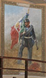 - NOTIZIE STORICO CRITICHE Tra la quarta e la quinta sala, lungo il percorso, lo stesso De Stefani ha realizzato, con la collaborazione del giovane Giuseppe Vizzotto Alberti, una seconda "serie di dieci "Ritratti di uniformi dell'Armata Sarda del 1859" tratti da modelli ad acquerello forniti dall'illustratore imolese Quinto Cenni e tratteggiati con pennellate asciutte, pulite, attente a rendere ogni figura con la necessaria chiarezza descrittiva e cromatica" [Regonelli S., Gli affreschi di San Martino della Battaglia. Il Risorgimento dipinto nel ciclo della Gran Torre, Torino, Allemandi & C. 2011, p. 39].