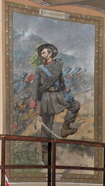 - NOTIZIE STORICO CRITICHE Tra la quarta e la quinta sala, lungo il percorso, lo stesso De Stefani ha realizzato, con la collaborazione del giovane Giuseppe Vizzotto Alberti, una seconda "serie di dieci "Ritratti di uniformi dell'Armata Sarda del 1859" tratti da modelli ad acquerello forniti dall'illustratore imolese Quinto Cenni e tratteggiati con pennellate asciutte, pulite, attente a rendere ogni figura con la necessaria chiarezza descrittiva e cromatica" [Regonelli S., Gli affreschi di San Martino della Battaglia. Il Risorgimento dipinto nel ciclo della Gran Torre, Torino, Allemandi & C. 2011, p. 39].