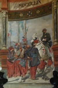 - NOTIZIE STORICO CRITICHE La sala al pianterreno è "dedicata alla celebrazione di Vittorio Emanuele II. I testi dell'epoca la descrivono come una vera e propria "Sala della Riconoscenza", realizzata come una ridotta versione del Pantheon romano, sepoltura del sovrano; l'architettura, infatti, ne riprende la struttura a pianta centrale, movimentata dall'apertura di spazi laterali chiusi da cancellate e la volta, culminante in un oculo decorato da un'elegante stella in ferro battuto. La medesima forma stellata, allusione alla leggendaria frase pronunciata dal re al momento della vittoria ("Havvi proprio una stella anche per l'Italia"), si ritrova anche all'ingresso della sala e nell'intarsio marmoreo pavimentale che circonda la base del suo ritratto bronzeo, che troneggia al centro della sala, opera dell'esperta mano del veneziano Antonio Dal Zotto. (...) Sulle pareti, invece, un altro veneziano, Vittorio Emanuele Bressanin, dipinse, a partire dal 1891, una serie di episodi tratti dalla gloriosa vita del primo re d'Italia". Il secondo episodio rappresenta Vittorio Emanuele al ponte di Palestro "mentre accoglie, col fare burbero e quasi contrariato dell'uomo d'azione, il festoso gruppo di zuavi che lanciano il kepì al cielo e alzano i fucili in segno di giubilo" [Regonelli S., Gli affreschi di San Martino della Battaglia. Il Risorgimento dipinto nel ciclo della Gran Torre, Torino, Allemandi & C. 2011, p. 36].