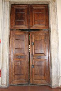 Porta rettangolare a due battenti con doppia apertura nella parte superiore, costituita da sei cornici specchiate e profilate a rilievo.