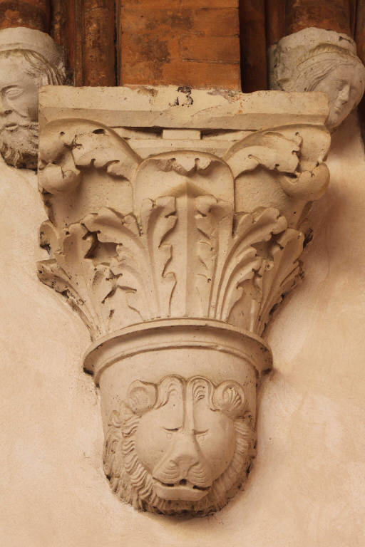 Peduccio figurato e a rilievo composto da una testa leonina sormontata da un capitello corinzio.