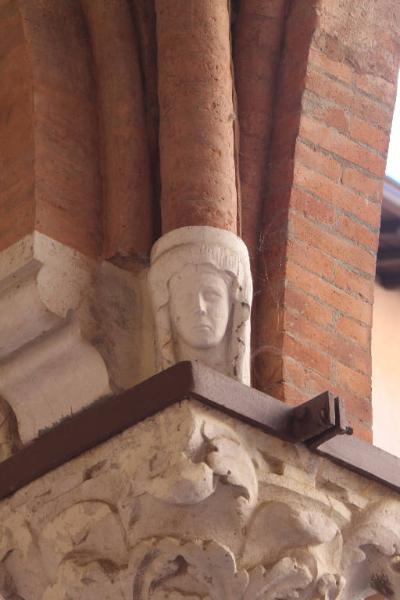 - NOTIZIE STORICO CRITICHE La loggia malatestiana, costruita nel primo quarto del XV secolo quando Pandolfo Malatesta divenne signore di Brescia e fece dell'ala settentrionale del Broletto la propria residenza, è stata restaurata e rimaneggiata più volte in tempi recenti. Tra gli anni Venti e Trenta del Novecento furono riaperti tre dei quattro archi a sesto acuto tamponati in un momento imprecisato della storia e riportate alla luce le ghiere in cotto degli archi oltre che la bifora che si trova al di sopra della loggia. Durante la seconda guerra mondiale, l'ala settentrionale del Broletto fu pesantemente danneggiata dai bombardamenti che colpirono la città e, a partire dal 1946, la zona bombardata venne restaurata e parzialmente ricostruita sotto la direzione dell'architetto Guido Marangoni. L'aspetto attuale della Loggia Malatestiana, dunque, è frutto principalmente di questo intervento post - bellico che, da un lato, ha messo in luce la quarta campata del portico che era nascosta da un fabbricato, ha salvaguardato l'impianto architettonico quattrocentesco così come i materiali scultorei e di decorazione architettonica originali salvatisi dai bombardamenti, dall'altro ha integrato in stile o ricostruito imitando l'originale ciò che è stato distrutto dalle bombe creando un insieme nel quale non è sempre facile distinguere ciò che è pertinente al XV secolo e ciò che è stato ricostruito forse riproponendo un modello originale. Questo aspetto si riscontra, soprattutto, nei peducci figurati che probabilmente sono stati realizzati a metà del Novecento riproducendo gli originali danneggiati.