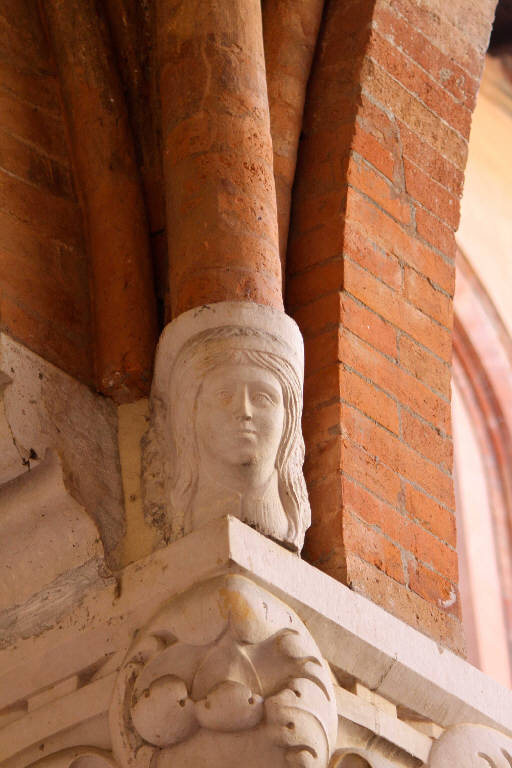 - NOTIZIE STORICO CRITICHE La loggia malatestiana, costruita nel primo quarto del XV secolo quando Pandolfo Malatesta divenne signore di Brescia e fece dell'ala settentrionale del Broletto la propria residenza, è stata restaurata e rimaneggiata più volte in tempi recenti. Tra gli anni Venti e Trenta del Novecento furono riaperti tre dei quattro archi a sesto acuto tamponati in un momento imprecisato della storia e riportate alla luce le ghiere in cotto degli archi oltre che la bifora che si trova al di sopra della loggia. Durante la seconda guerra mondiale, l'ala settentrionale del Broletto fu pesantemente danneggiata dai bombardamenti che colpirono la città e, a partire dal 1946, la zona bombardata venne restaurata e parzialmente ricostruita sotto la direzione dell'architetto Guido Marangoni. L'aspetto attuale della Loggia Malatestiana, dunque, è frutto principalmente di questo intervento post - bellico che, da un lato, ha messo in luce la quarta campata del portico che era nascosta da un fabbricato, ha salvaguardato l'impianto architettonico quattrocentesco così come i materiali scultorei e di decorazione architettonica originali salvatisi dai bombardamenti, dall'altro ha integrato in stile o ricostruito imitando l'originale ciò che è stato distrutto dalle bombe creando un insieme nel quale non è sempre facile distinguere ciò che è pertinente al XV secolo e ciò che è stato ricostruito forse riproponendo un modello originale. Questo aspetto si riscontra, soprattutto, nei peducci figurati che probabilmente sono stati realizzati a metà del Novecento riproducendo gli originali danneggiati.