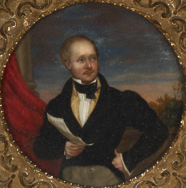 - NOTIZIE STORICO CRITICHE Il dipinto è il pendant dell'inv. n. 38155 "ritratto di donna" con il quale condivide dimensioni, caratteristiche materiali e stilistiche. Anche la cornice in legno intagliato e dorato di pregievole fattura è identica. I dati compositivi e stilistici, come quelli dell'abbigliamento e delle acconciature degli effigiati permettono di riferire entrambe le opere al contesto della ritrattistica milanese del terzo decennio del XIX secolo.