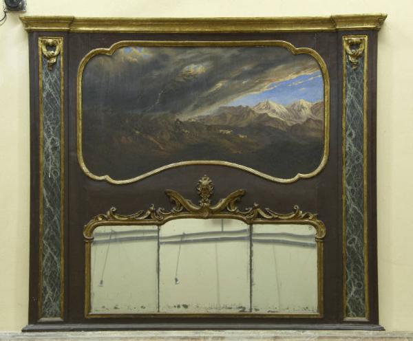 Grande caminiera da parete costituita da due lesene laterali con motivo a finto marmo, specchiera tripartita sormontata da profilo mistilineo decorativo e grande pannello dipinto racchiuso entro conice anch'essa mistiliena.