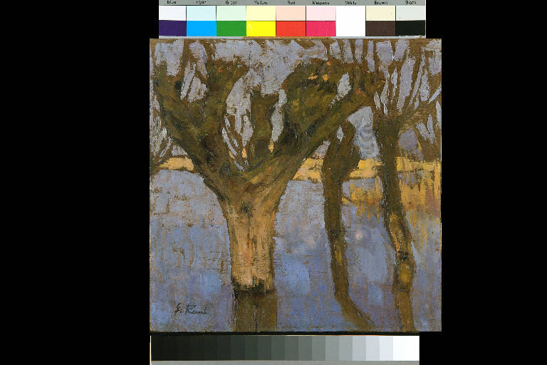- NOTIZIE STORICO CRITICHE Il colore del supporto in compensato di noce è stato utilizzato dall'artista come fondo materico nella resa del tronco degli alberi immersi nelle acque in piena del lago di Mantova.\nAttivo dal 1920, quando partecipa all'Esposizione del Paesaggio Italiano di Gardone, Resmi si dedica principalmente alla restituzione delle atmosfere e degli scorci del paesaggio mantovano attraverso la pittutra e l'incisione. Nel corso degli anni Trenta "si assiste ad una modificazione nella sua arte dovuta a un'interpretazione del paesaggio secondo regole costruttive alla Cézanne, ma alla luce della sensibilità europea degli antinovecentisti mantovani. Le opere pittoriche sono segnate da un abbassamento tonale, da una semplificazione dei piani cromatici, forse dovuta all'incontro con il Chiarismo lombardo, oltre che con Morandi" [Casarin R., "Guido Resmi" in "Schede bibliografiche", in "Arte a Mantova. 1900-1950", mostra a cura di Birolli Z.., Mantova, Palazzo Te 1999-2000, p. 194]. Prosegue la sua produzione anche durante il secondo conflitto mondiale e nel Dopoguerra, "in occasione della Mostra Nazionale di Pittura e Scultura Premio Mantova 1949 tenutasi a Palazzo della Ragione di Mantova, 18 dicembre-15 gennaio 1950, figura con l'opera: Angolo di piazza Virgiliana" ["Artisti a Mantova nei secoli XIX e XX. Dizionario biografico", a cura di Sartori A. e Sartori A., Mantova 1999-2004, p. 2577].