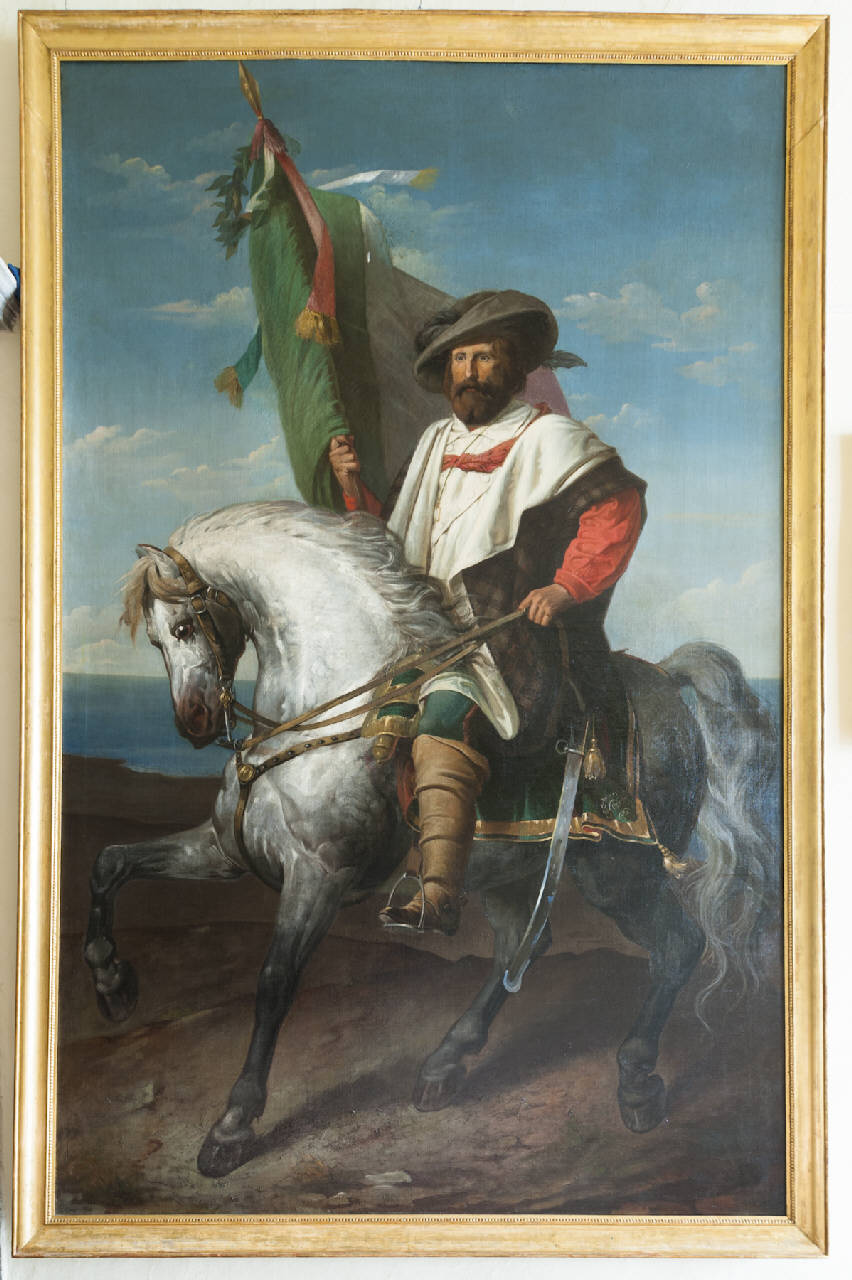 - NOTIZIE STORICO CRITICHE L'opera fu riprodotta dal fotografo G. Negri di Brescia tra il 1888 e il 1904, forse nel 1893 quando l'opera fu esposta nella mostra patriottica organizzata all'Accademia Tadini: sulla stampa della fotografia conservata presso l'Accademia (cart. 40, inv. 499, cat. 38) compare la scritta "Questo quadro apparteneva al Circolo degli Amici in Roma, e stette nascosto sotto una tapezzeria nelle sale del circolo dal 1849 al 1870. Riproduzione del quadro di S. Rossini". Fu lo stesso Zitti a segnalare la foto ad Alfredo Comandini che lo pubblicò nella sua opera "L'Italia nei cento anni del secolo 19." del 1902-1907. Risulta quindi individuata la fonte della notizia che vuole il dipinto realizzato negli anni della Repubblica Romana (1848-1849) recepita da G. A. Scalzi (in Crescit Eundo 2003, p. 115), che è però contraddetta dalla data 1863 individuata, insieme alla corretta lettura della firma, da chi scrive e dalla restauratrice Roberta Grazioli in occasione della mostra di Genova. \nQuesti dati confermerebbero la provenienza romana e suggerirebbero di riferire l'acquisto al patriota e industriale Giovanni Andrea Gregorini (1819-1878), che fu dal 1870 alla morte deputato; il Monumento ai volontari (1865) ne conferma l'orientamento politico con la partecipazione all'"Impresa di Cedegolo" nel 1859. \nVa tuttavia precisato che questo non identifica con certezza la committenza, e che persino l'indicazione "Gregorini" confermata dall'Elenco delle opere esposte a Lovere nel 1893 va accolta con cautela, dal momento che erede di Giovanni Andrea fu il nipote, Felice Ventura (1836-1882), che assunse il doppio cognome Ventura Gregorini, i cui eredi hanno confermato nel 1961 la donazione all'Accademia. Di Felice Ventura Gregorini si conosce la partecipazione alla campagna del 1859 nei Cacciatori delle Alpi sullo Stelvio e alla seconda spedizione in Sicilia nel 1860; combatté a Milazzo e al Volturno, meritando una menzione onorevole. \nIl dipinto fu realizzato da Francesco Rossini nel 1863. In quell'anno Giuseppe Garibaldi si trovava in convalescenza presso l'isola di Caprera per riprendersi dalla ferita riportata nella battaglia dell'Aspromonte. Il pittore raffigurò il generale in sella al suo cavallo, una giumenta grigia di 14 anni chiamata Marsala dono di Sebastiano Giacalone Angileri. In sella a Marsala Garibaldi entrò a Palermo il 27 maggio 1860 e continuò tutta la campagna militare nel regno delle Due Sicilie. Si affezionò all'animale a tal punto da tenerlo sino alla morte avvenuta nel 1876, alla veneranda età di trent'anni.\nL'opera, che per questo ed altri elementi iconografici (ad esempio la camicia rossa, o il celebre poncho) appare celebrativa della Spedizione dei Mille, presenta in realtà un accumulo di elementi che ne fanno una sorta di centone dell'iconografia garibaldina: particolarmente significativa l'aggiunta del cappello alla calabrese teso a connotarlo come eroe della Repubblica Romana. Tuttavia, l'individuazione del possibile modello in una o più stampe popolari, unico veicolo di diffusione dell'iconografia risorgimentale pre-unitaria, potrebbe giustificare la scelta di sommare tutti gli elementi propri dell'iconografia del generale (Albertario 2008). La precocità fa della tela uno tra i pochi "monumenti equestri" dedicati a Garibaldi in vita.\nMarco Albertario