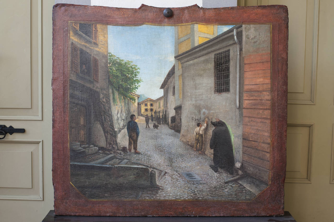 - NOTIZIE STORICO CRITICHE Si tratta di un esempio di parafuoco dipinto realizzato da A. Vinetti nel 1881, come riporta l'iscrizione in alto a destra, raffigurante uno spaccato di vita quotidiana in una via di Lovere con accenti anticlericali. Tra i passanti è riconoscibile di spalle la figura del parroco don Domenico Poletti, che rimprovera un ragazzo intento a scrivere un'espressione inneggiante a Garibaldi sul muro di una casa. Poco o nulla si sa invece del pittore, probabilmente un artista locale, del quale si conosce solo un'altra opera, un ritratto di Giovanni Battista Zitti, realizzato nel 1884.\nIl parafuoco è ciò che resta, insieme ad una targa (num. inv. Museo del Risorgimento MRO54) e ad un nucleo di ritratti, della decorazione della villa che Zitti acquistò nel 1887 sull'altopiano di Bossico e che ribattezzò "Caprera". L'edificio, probabilmente sorto ad imitazione di quello dell'amico Vittore Tasca a Brembate, fu sede di un cenacolo culturale di cui fece parte anche Cesare Tallone.
