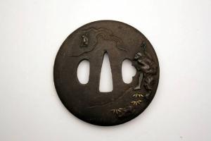 Elsa di spada giapponese di forma tonda con i tre fori canonici, quello centrale (nakagoana) per il codolo, il foro di sinistra (kozuka hitsuana) per il coltellino, e quello di destra (kogai hitsuana) per lo spillone. E' raffigurato Sennin Tekkai, uno degli otto principali geni immortali taoisti.