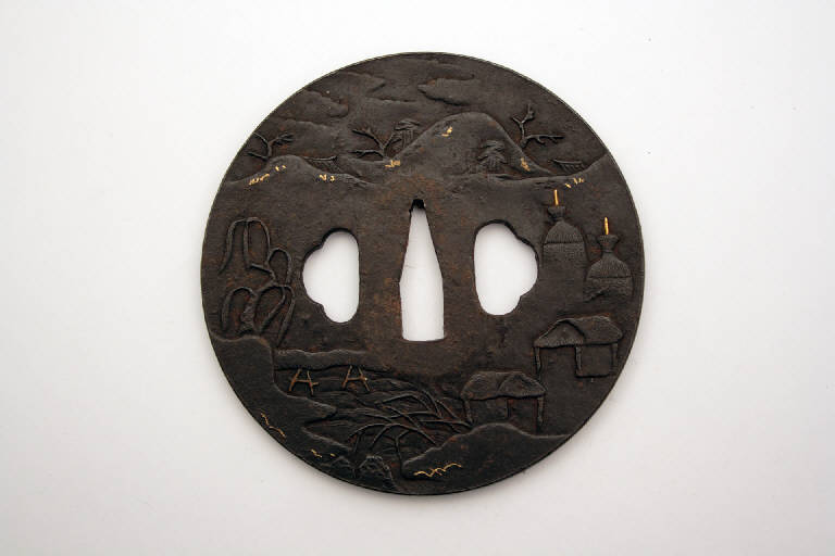 Elsa di spada giapponese di forma tonda, con bordo maru mimi e i tre fori canonici, quello centrale (nakagoana) per il codolo, il foro di sinistra (kozuka hitsuana) per il coltellino, e quello di destra (kogai hitsuana) per lo spillone. E' rappresentato un paesaggio invernale. Due figure attraversano un ponte per arrivare ad una casa. In lontanza è visibile una pagoda. Alberi e montagne sono ricoperti di neve. Il verso rappresenta un villaggio, con tetti che sbucano da dietro le montagne.