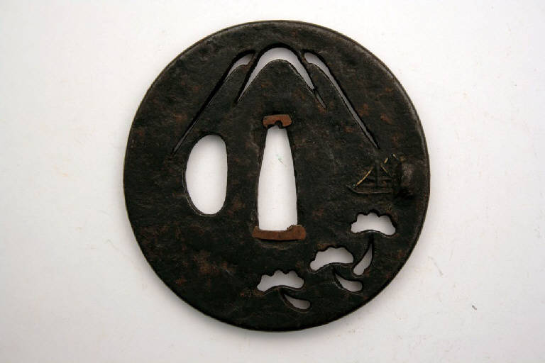 Elsa di spada giapponese di forma tonda e bordo leggermente rialzato, con i tre fori canonici, quello centrale (nakagoana) per il codolo, il foro di sinistra (kozuka hitsuana) per il coltellino, e quello di destra (kogai hitsuana) per lo spillone. Rappresenta alberi di pino sotto il monte Fuji.