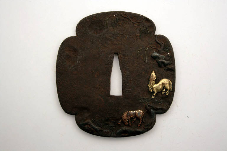 - NOTIZIE STORICO CRITICHE In Giappone l'elsa è detta "tsuba". La sua funzione primaria è quella di fare in modo che la mano di chi impugna la spada non finisca sulla propria lama, oltre a bilanciare la spada e a proteggere la mano dalla lama dell'avversario.\nIndirettamente, gli tsuba servivano anche a mostrare lo stato sociale e il gusto personale e, come per altri oggetti d'uso, divennero presto un mezzo d'espressione artistica.\nDal XIX secolo, quando la spada e i suoi accessori divennero più decorativi che funzionali, e ancor più dal 1878, a seguito della proibizione di portare la spada, gli tsuba erano prodotti come oggetti da collezione favoriti dagli occidentali, che li vedevano come una originale e nuova forma d'arte. Molti di questi oggetti raggiunsero infatti l'Europa già nell'Ottocento.\n\nL¿allevamento dei cavalli era un importante aspetto della cultura e stile di vita della nobiltà e l'aristocrazia giapponese. Si credeva inoltre che il cavallo contribuisse al controllo della pioggia e della siccità.