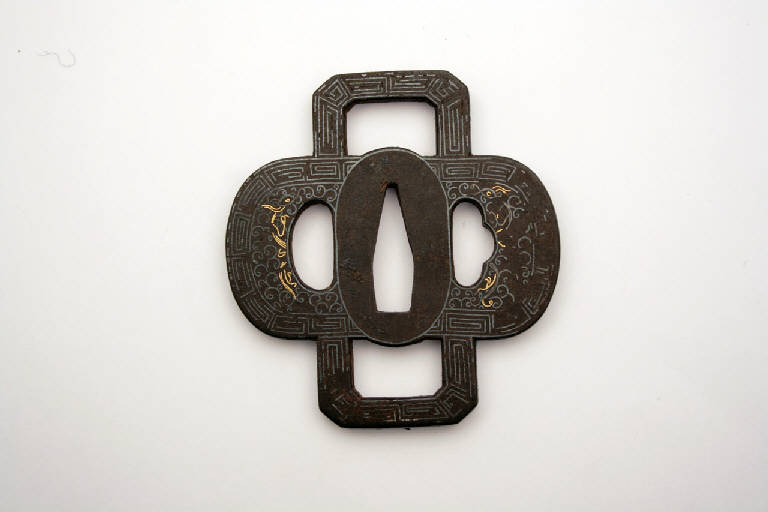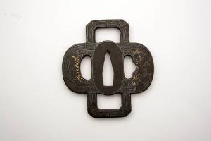 Elsa di spada di tipo juji gata, con i tre fori canonici, quello centrale (nakagoana) per il codolo, il foro di sinistra (kozuka hitsuana) per il coltellino, e quello di destra (kogai hitsuana) per lo spillone. I bordi sono decorati con greche in argento e il centro è campito da girali, karakusa.