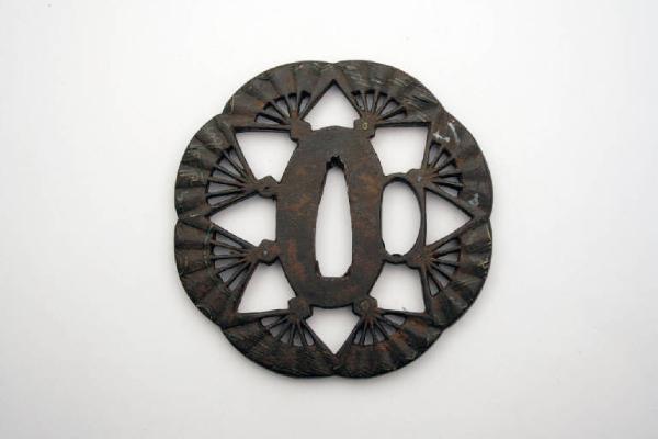Elsa di spada a forma ottagonale. Sono presenti il foro centrale per il codolo (nakagoana) e il foro di sinistra (kozuka hitsuana). Traforo a giorno a motivo di otto ventagli.