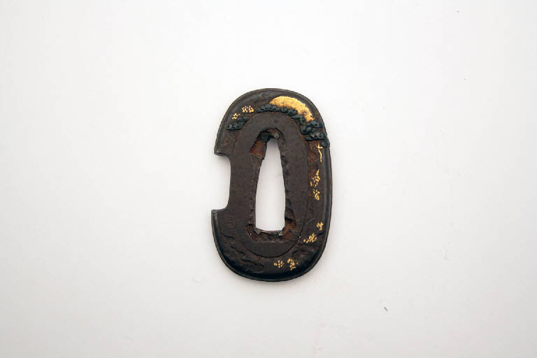 Elsa di spada giapponese per coltello (tanto), a forma ovale, con una rientranza laterale per il coltellino. E' rappresentato un paesaggio con alberi di pino. Per l'intarsio in oro ed in argento sono usate due tecniche diverse: la tecnica suemon zogan, in cui la decorazione appare in rilievo, e la tecnica nunome, o ageminatura, anche chiamata falsa incisione.