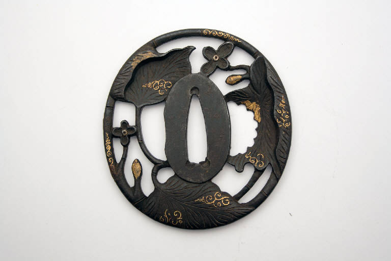 - NOTIZIE STORICO CRITICHE In Giappone l'elsa è detta "tsuba". La sua funzione primaria è quella di fare in modo che la mano di chi impugna la spada non finisca sulla propria lama, oltre a bilanciare la spada e a proteggere la mano dalla lama dell'avversario.\nIndirettamente, gli tsuba servivano anche a mostrare lo stato sociale e il gusto personale e, come per altri oggetti d'uso, divennero presto un mezzo d'espressione artistica.\nDal XIX secolo, quando la spada e i suoi accessori divennero più decorativi che funzionali, e ancor più dal 1878, a seguito della proibizione di portare la spada, gli tsuba erano prodotti come oggetti da collezione favoriti dagli occidentali, che li vedevano come una originale e nuova forma d'arte. Molti di questi oggetti raggiunsero infatti l'Europa già nell'Ottocento.\n\nI fori laterali, hitsuana servivano a lasciare passare i manici dei piccoli oggetti decorativi e d'uso che sporgevano dal fodero.\n\nQuello di ciliegio è forse il fiore preferito dai giapponesi. Esso è ampiamente citato in letteratura e rappresentato in arte. Soprattutto, il fiore di ciliegio era un simbolo caro ai samurai, perché, cadendo nel pieno della fioritura, ricordava la sorte del guerriero caduto improvvisamente in battaglia.