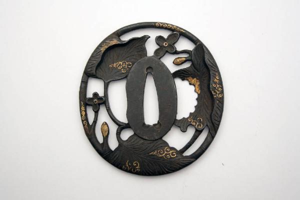 Elsa di spada giapponese di forma tonda, con bordo a forma di bastone di bambù, con i tre fori canonici, quello centrale (nakagoana) per il codolo, il foro di sinistra (kozuka hitsuana) per il coltellino, e quello di destra (kogai hitsuana) per lo spillone. Rappresenta tre foglie di aoi, e fiori di ciliegio. Il bordo è a forma di stelo di bambù, mentre il kogai hitsuana è a forma di foglia mangiata dagli insetti.
