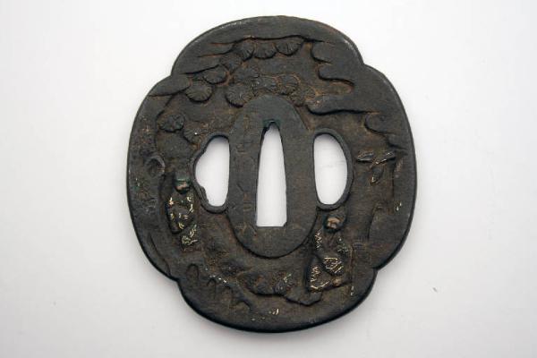 Elsa di spada giapponese di forma quadrilobata (mokkogata), con i tre fori canonici, quello centrale (nakagoana) per il codolo, il foro di sinistra (kozuka hitsuana) per il coltellino, e quello di destra (kogai hitsuana) per lo spillone. Rappresenta sul fronte sei uomini con un elefante, e sul verso altre due figure sotto un pino. I visi dei personaggi sono stati realizzati ad intarsio d'ottone, mentre per l'elefante è stata utilizzata la tecnica nunome, o ageminatura, anche chiamata falsa incisione.
