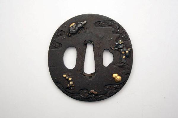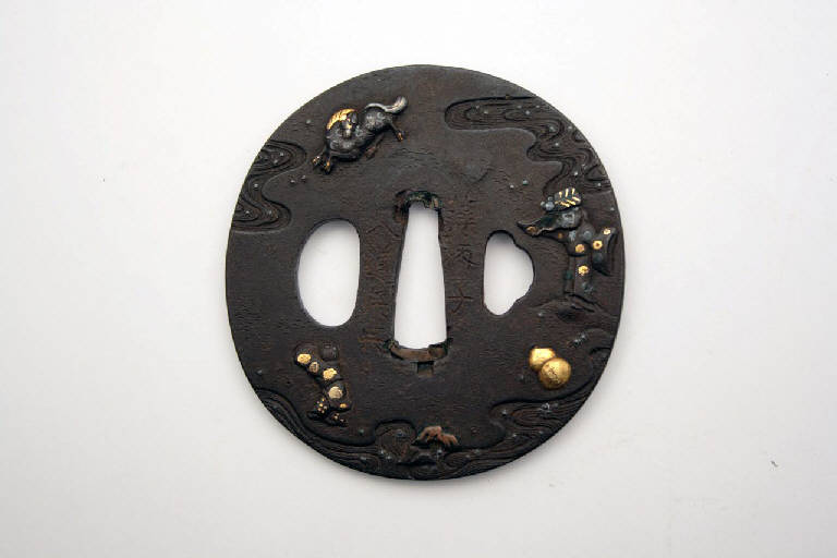 Elsa di spada giapponese di forma ovale, con i tre fori canonici, quello centrale (nakagoana) per il codolo, il foro di sinistra (kozuka hitsuana) per il coltellino, e quello di destra (kogai hitsuana) per lo spillone. Rappresenta Chokaro (Zhang Guolao), uno degli otto immortali taoisti, che convoca il suo cavallo attraverso una zucca. Gli intarsi in rilievo (suemon zogan) sono in oro, ottone e argento.