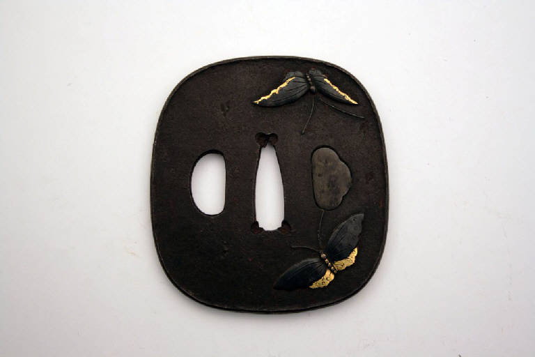- NOTIZIE STORICO CRITICHE In Giappone l'elsa è detta "tsuba". La sua funzione primaria è quella di fare in modo che la mano di chi impugna la spada non finisca sulla propria lama, oltre a bilanciare la spada e a proteggere la mano dalla lama dell'avversario.\nIndirettamente, gli tsuba servivano anche a mostrare lo stato sociale e il gusto personale e, come per altri oggetti d'uso, divennero presto un mezzo d'espressione artistica.\nDal XIX secolo, quando la spada e i suoi accessori divennero più decorativi che funzionali, e ancor più dal 1878, a seguito della proibizione di portare la spada, gli tsuba erano prodotti come oggetti da collezione favoriti dagli occidentali, che li vedevano come una originale e nuova forma d'arte. Molti di questi oggetti raggiunsero infatti l'Europa già nell'Ottocento.\n\nSia in Cina che in Giappone le farfalle erano viste come anime e come simbolo di gioia e longevità. Le due farfalle affrontate sono inoltre simbolo di una felice vita coniugale.\n\nLo shakudo è una lega di rame e oro con al 94-99%, oro all' 1-6%, una minima quantità di argento, e tracce di antimonio, arsenico e piombo. Esso era patinato con bagni in soluzione acida per assumere un colore nero violastro. Il signore feudale del XVI secolo Toyotomi Hideyoshi legò il colore di questa lega all'imagine della pioggia sulle ali del corvo.