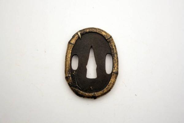 Elsa di spada giapponese di forma ovale, di piccole dimensioni, per spada corta, con bordo ripiegato sulla superficie che assume la forma di stelo di bambù. Presenta i tre fori canonici, quello centrale (nakagoana) per il codolo, il foro di sinistra (kozuka hitsuana) per il coltellino, e quello di destra (kogai hitsuana) per lo spillone. La decorazione, realizzata con un intarsio in oro e shakudo, rappresenta delle foglie, un fiore e una melanzana.