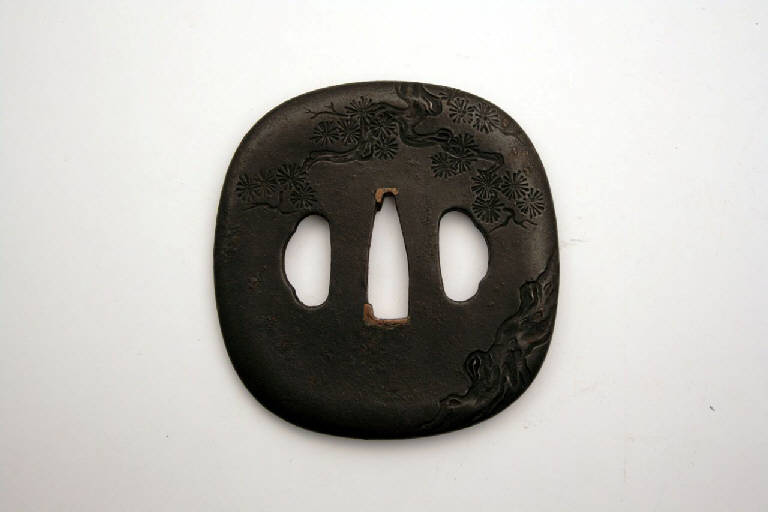 - NOTIZIE STORICO CRITICHE In Giappone l'elsa è detta "tsuba". La sua funzione primaria è quella di fare in modo che la mano di chi impugna la spada non finisca sulla propria lama, oltre a bilanciare la spada e a proteggere la mano dalla lama dell'avversario.\nIndirettamente, gli tsuba servivano anche a mostrare lo stato sociale e il gusto personale e, come per altri oggetti d'uso, divennero presto un mezzo d'espressione artistica.\nDal XIX secolo, quando la spada e i suoi accessori divennero più decorativi che funzionali, e ancor più dal 1878, a seguito della proibizione di portare la spada, gli tsuba erano prodotti come oggetti da collezione favoriti dagli occidentali, che li vedevano come una originale e nuova forma d'arte. Molti di questi oggetti raggiunsero infatti l'Europa già nell'Ottocento.\n\nDegli spessori di rame sono stati applicati ai vertici del nakagoana per fermare perfettamente l'elsa sulla lama.\n\nQuella del pino è una immagine molto comune nell'arte giapponese. La sua simbologia ha derivazione cinese. Essendo una pianta sempreverde il pino è infatti associato alla longevità e al buon augurio. Esso è inoltre simbolo dell'inverno e del Nuovo Anno. Ad esso sono inoltre legate innumerevoli leggende del folclore. La valenza benaugurale di longevità è qui aumentata dalla presenza della Gru, veicolo di Fukurokuju.\n\nLo shakudo è una lega di rame e oro con al 94-99%, oro all' 1-6%, una minima quantità di argento, e tracce di antimonio, arsenico e piombo. Esso era patinato con bagni in soluzione acida per assumere un colore nero violastro. Il signore feudale del XVI secolo Toyotomi Hideyoshi legò il colore di questa lega all'imagine della pioggia sulle ali del corvo.