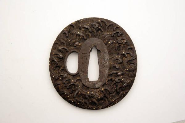 Elsa di spada giapponese di forma ovale. Sono presenti il foro centrale (nakagoana), per il codolo della lama, e il foro di sinistra (kozuka hitsuana). La decorazione, a motivo di onde, è stata incisa molto profondamente, e la schiuma prodotta dall'infrangersi di queste è stata realizzata con intarsi in ottone o oro.