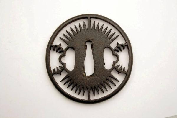 - NOTIZIE STORICO CRITICHE In Giappone l'elsa è detta "tsuba". La sua funzione primaria è quella di fare in modo che la mano di chi impugna la spada non finisca sulla propria lama, oltre a bilanciare la spada e a proteggere la mano dalla lama dell'avversario.\nIndirettamente, gli tsuba servivano anche a mostrare lo stato sociale e il gusto personale e, come per altri oggetti d'uso, divennero presto un mezzo d'espressione artistica.\nDal XIX secolo, quando la spada e i suoi accessori divennero più decorativi che funzionali, e ancor più dal 1878, a seguito della proibizione di portare la spada, gli tsuba erano prodotti come oggetti da collezione favoriti dagli occidentali, che li vedevano come una originale e nuova forma d'arte. Molti di questi oggetti raggiunsero infatti l'Europa già nell'Ottocento.\n\nQuesto tsuba, è definito da alcuni autori "a ingranaggio d'orologio", sebbene sia probabile che la forma dentellata sia in effetti la stilizzazione di un elemento fitomorfo. Stile Akasaka.