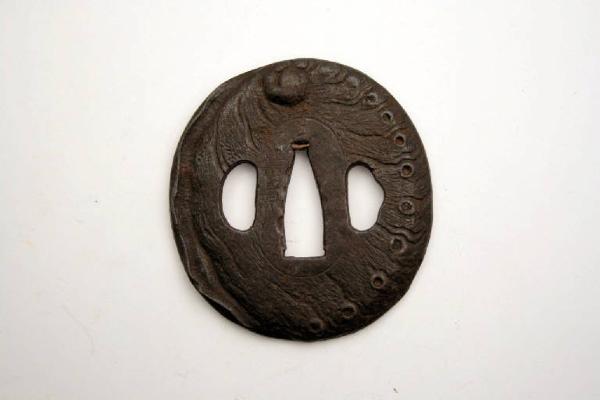 Elsa di spada giapponese di forma ovale, con i tre fori canonici, quello centrale (nakagoana) per il codolo, il foro di sinistra (kozuka hitsuana) per il coltellino, e quello di destra (kogai hitsuana) per lo spillone. Rappresenta una orecchia di mare (awabi).