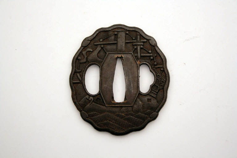 Elsa di spada giapponese di forma ovale con bordo lobato, con i tre fori canonici, quello centrale (nakagoana) per il codolo, il foro di sinistra (kozuka hitsuana) per il coltellino, e quello di destra (kogai hitsuana) per lo spillone. Sulla superficie è raffigurata a rilievo una nave fra le onde.