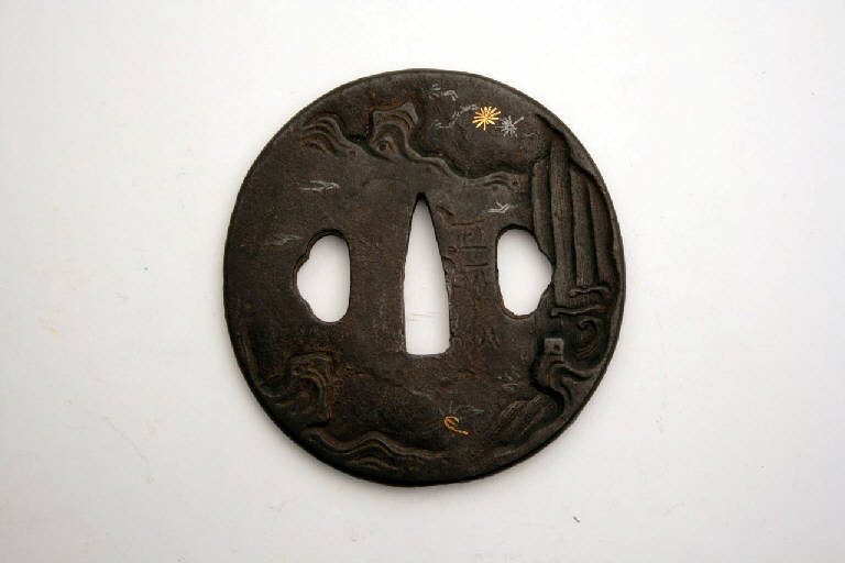 Elsa di spada giapponese di forma ovale, con i tre fori canonici, quello centrale (nakagoana) per il codolo, il foro di sinistra (kozuka hitsuana) per il coltellino, e quello di destra (kogai hitsuana) per lo spillone. E' rappresentato un paesaggio montano con rocce ed una cascata.