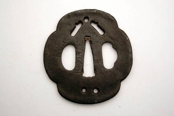 Elsa di spada giapponese di forma quadrilobata (mokko), con i tre fori canonici, quello centrale (nakagoana) per il codolo, il foro di sinistra (kozuka hitsuana) per il coltellino, e quello di destra (kogai hitsuana) per lo spillone. La decorazione è realizzata a traforo con motivo di segmenti, obliqui con un foro centrale. In basso, i due fori udenukiana per il passaggio di un cordino.