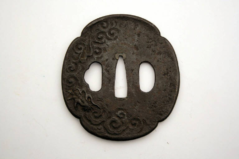 Elsa di spada giapponese di forma quadrilobata (mokko), con bordo leggermente rialzato, con i tre fori canonici, quello centrale (nakagoana) per il codolo, il foro di sinistra (kozuka hitsuana) per il coltellino, e quello di destra (kogai hitsuana) per lo spillone. E' raffigurato un drago fra le nuvole.