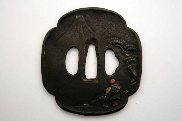 Elsa di spada giapponese di forma quadrilobata (mokko), con bordo rialzato rispetto alla superficie, con i tre fori canonici, quello centrale (nakagoana) per il codolo, il foro di sinistra (kozuka hitsuana) per il coltellino, e quello di destra (kogai hitsuana) per lo spillone. E' rappresentato un uomo con il cappello in mano, che ammira il monte Fuji sotto un albero di pino.