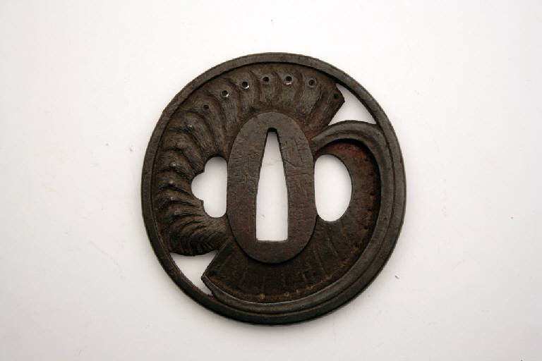 - NOTIZIE STORICO CRITICHE In Giappone l'elsa è detta "tsuba". La sua funzione primaria è quella di fare in modo che la mano di chi impugna la spada non finisca sulla propria lama, oltre a bilanciare la spada e a proteggere la mano dalla lama dell'avversario.\nIndirettamente, gli tsuba servivano anche a mostrare lo stato sociale e il gusto personale e, come per altri oggetti d'uso, divennero presto un mezzo d'espressione artistica.\nDal XIX secolo, quando la spada e i suoi accessori divennero più decorativi che funzionali, e ancor più dal 1878, a seguito della proibizione di portare la spada, gli tsuba erano prodotti come oggetti da collezione favoriti dagli occidentali, che li vedevano come una originale e nuova forma d'arte. Molti di questi oggetti raggiunsero infatti l'Europa già nell'Ottocento.